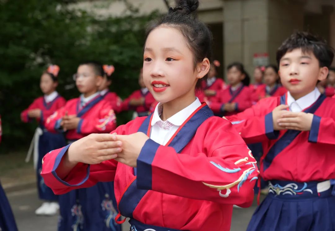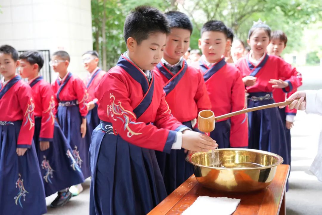 沃盥禮是中國古代在祭祀典禮之前的重要禮儀。此禮儀蘊含著凈手凈心,去雜存精,也希望孩子們能在成長的過程中洗去浮躁、稚氣,留下沉穩(wěn)和儒雅。