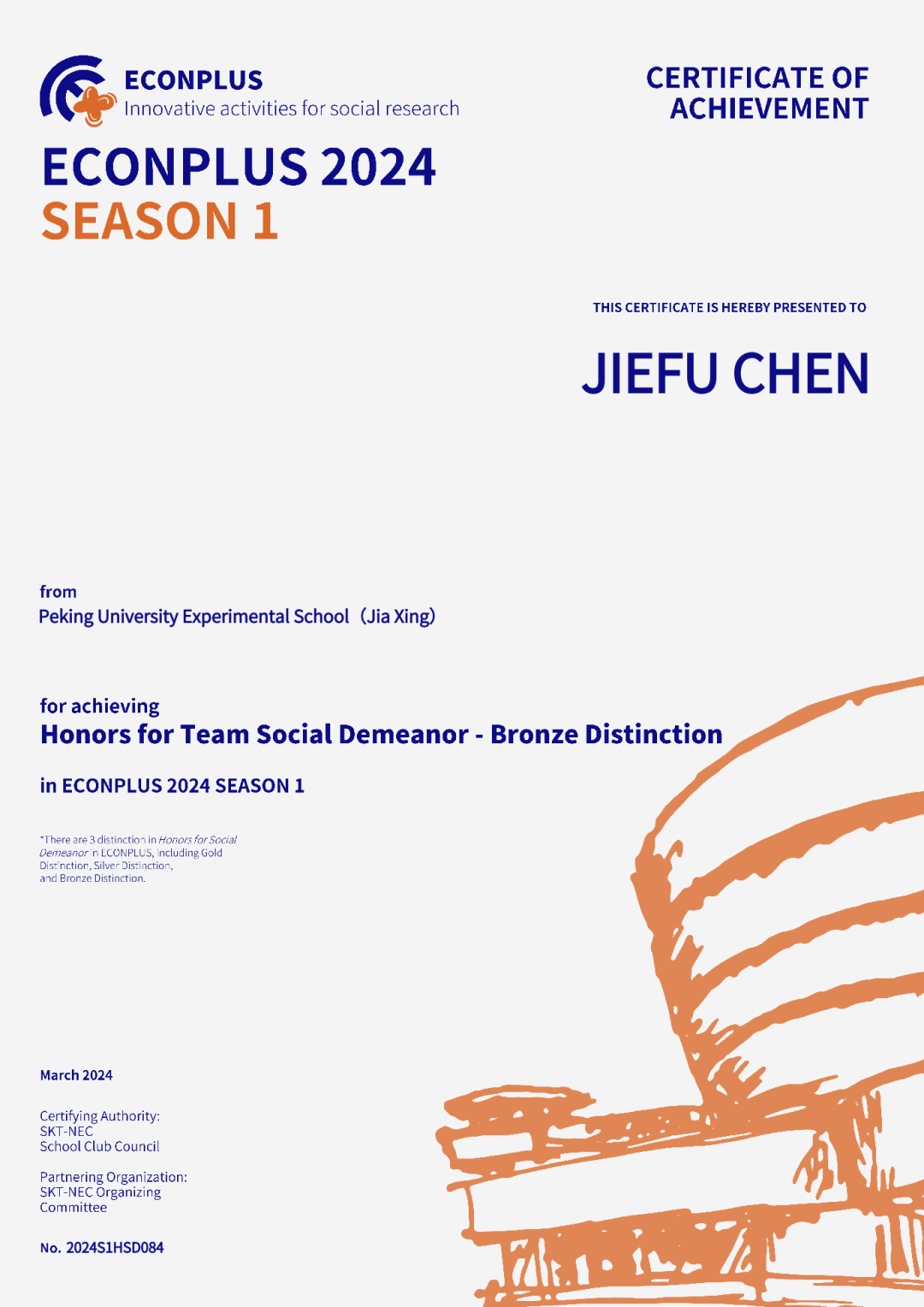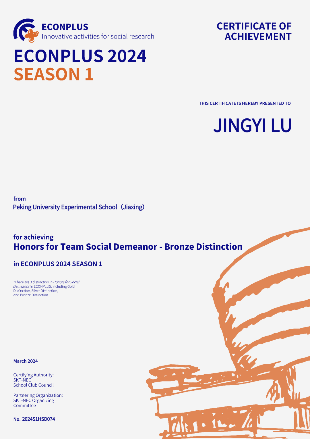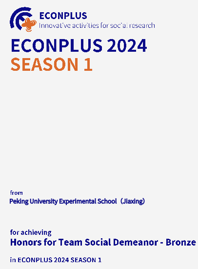 The award won by EconPlus 2024 in Economics Social Innovation Research has deepened my understanding of economic theory and made me realize its application value in practical social problems. At the same time, this award is an affirmation of my efforts and an encouragement for my future academic exploration. EconPlus 2024在經(jīng)濟(jì)學(xué)社會(huì)創(chuàng)新研究中獲得的獎(jiǎng)項(xiàng)加深了我對(duì)經(jīng)濟(jì)學(xué)理論的理解,讓我意識(shí)到經(jīng)濟(jì)學(xué)理論在實(shí)際社會(huì)問題中的應(yīng)用價(jià)值。同時(shí),這個(gè)獎(jiǎng)項(xiàng)也是對(duì)我努力的肯定和對(duì)我未來學(xué)術(shù)探索的鼓勵(lì)。